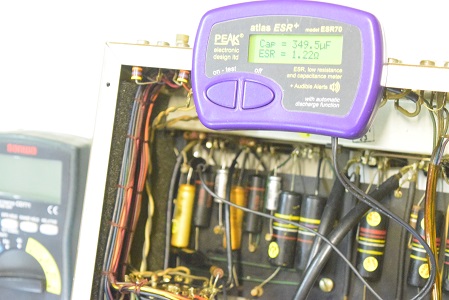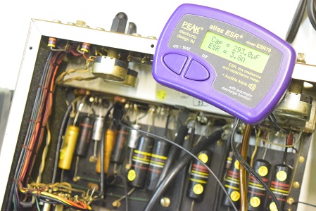 交換されていないオリジナルです。静電容量が1.5倍に膨れESRが高い状態です。ESRが高くなると音が荒んできます。