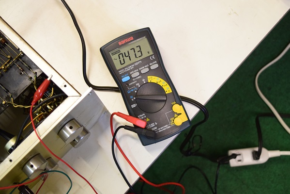 フロントパネルを触ると少しピリピリするので筐体-N極の漏れ電圧を計りました。 AC47.3Vを示し少し電源トランスの漏電があります。