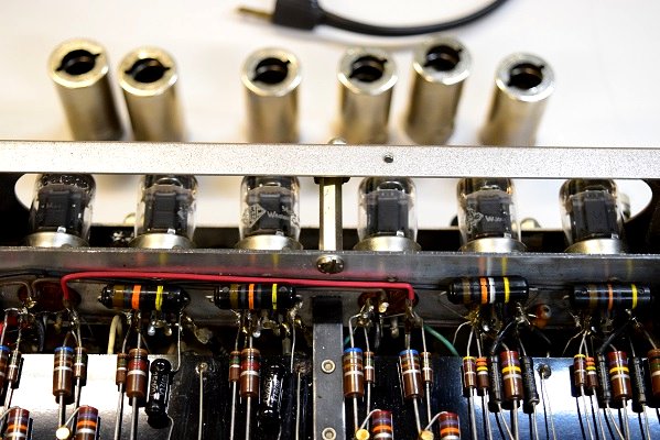 横一列の小さなカップリングコンデンサーも全て良品のバンブルビーです。使用真空管は全てダイヤマークのTelefunken ECC83 です。