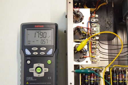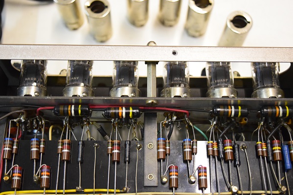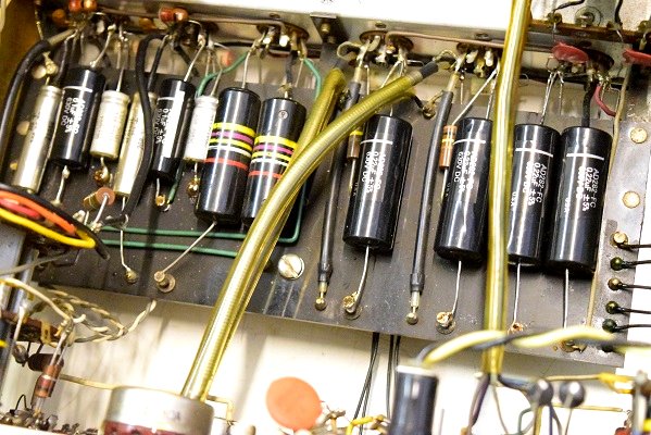 裏面です。左下の黄色いコンデンサーも今回交換しました。純正SPRAGUEのNOS品です。S/N 10500〜12000番台辺りまで付いている音の良いものです。この他、低域のNFBの値を決める抵抗も正確な物に交換しています。