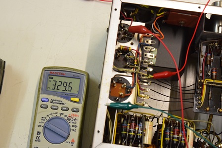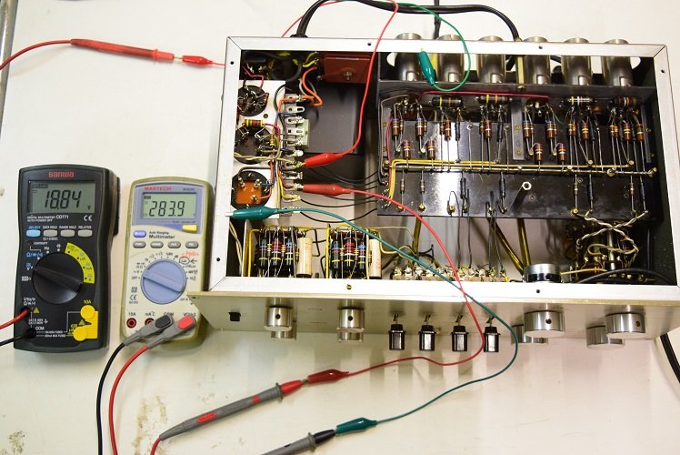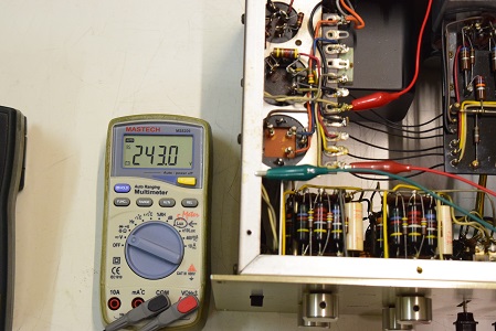 左テスターはヒーター電圧です。18.87Vを示し良好です。右の白いテスターは高圧B1です。284.1Vで非常に良い値です。