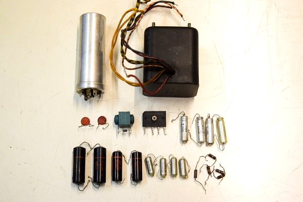 交換部品です。今回も大物が並んでいます。青い高圧セレンに小さなダイオードがぶら下がっています。