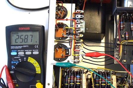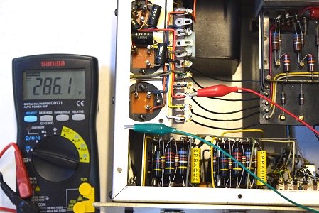 電源トランス2次側です。AC280.8Vを示し一応良好です。