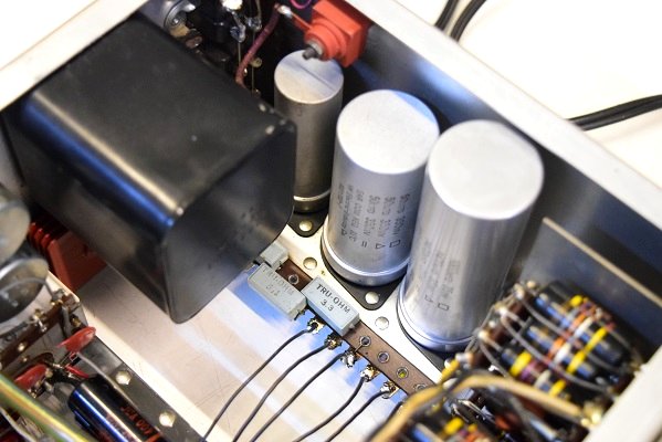 裏面です。電源の抵抗を全て高級品に交換しました。各真空管のプレート抵抗も同じく高級品に交換しました。これにより音の通りがよくなり歯切れの良い音が堪能できます。