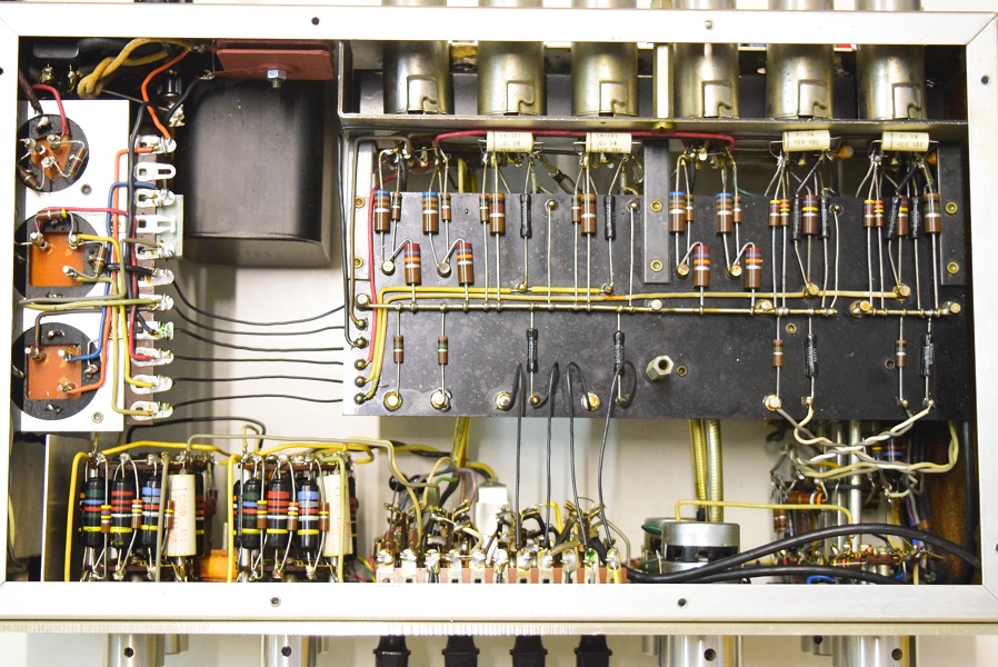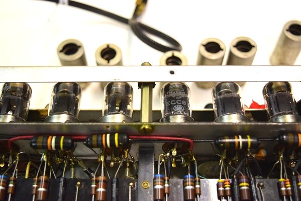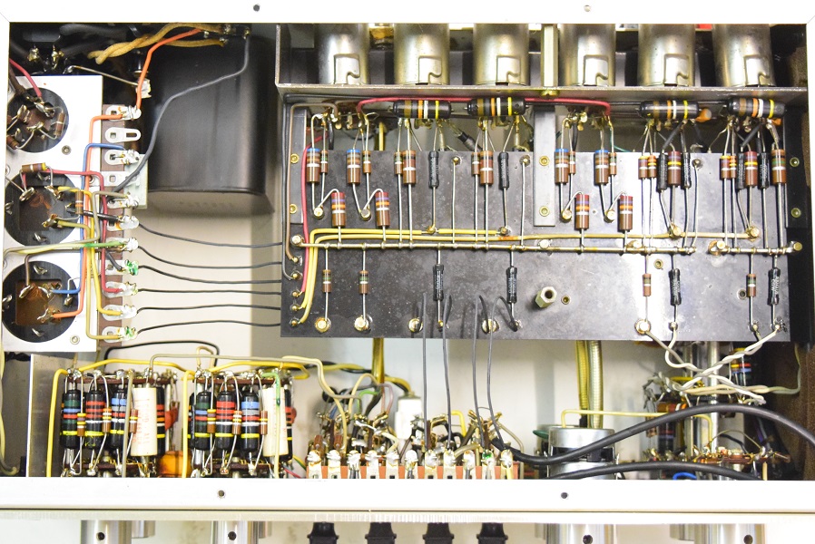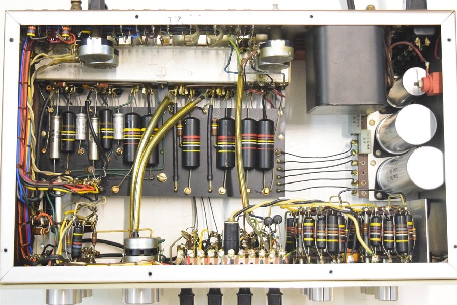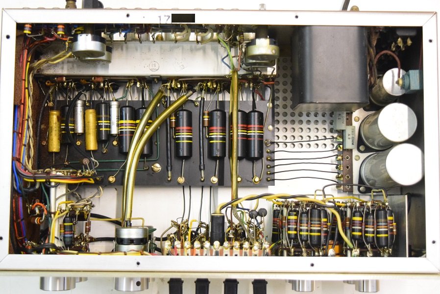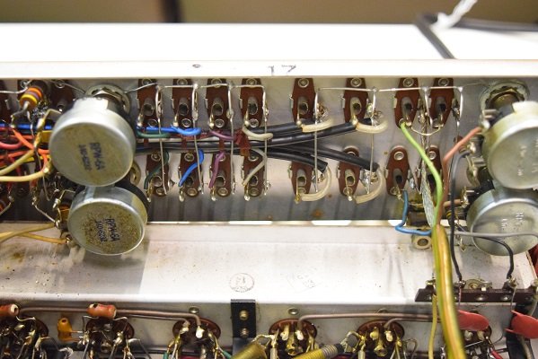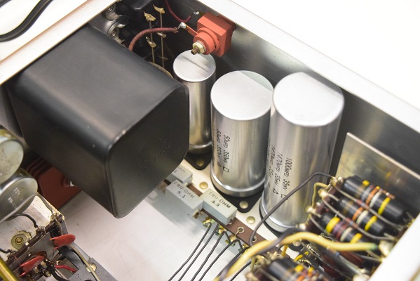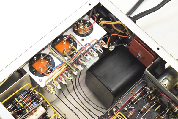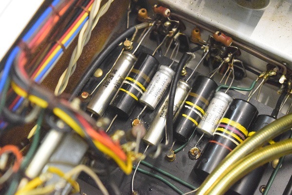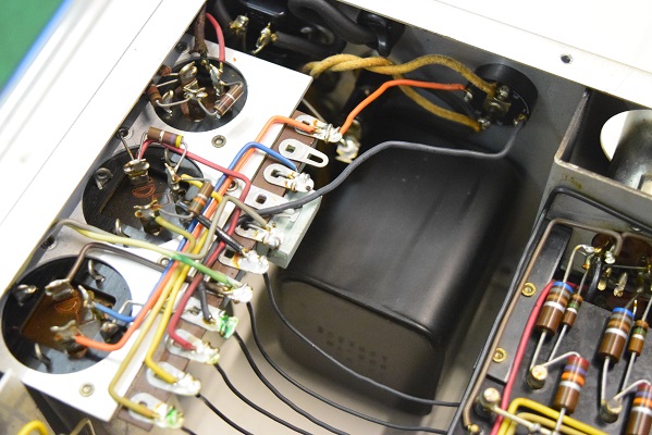 裏面です。低圧セレンも交換しました。横一列のカップリングコンデンサーは音の良いGoodAll-TRWの新品に交換しました。