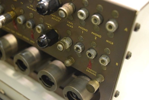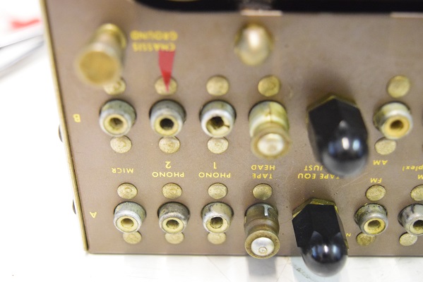 裏のフォノイコのRCA端子です。中の絶縁体が割れて落ちるので瞬間接着剤で付けました。純正端子に交換もできますがここはかなり大変な個所で、リベット留めの場合この部分を全て分解しなくてはならずかなりコストが掛かります。また交換すると姿が変わりオリジナルの価値が無くなるので補修に留めました。