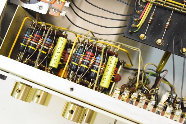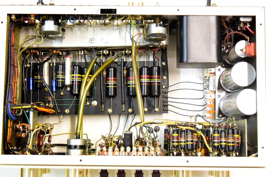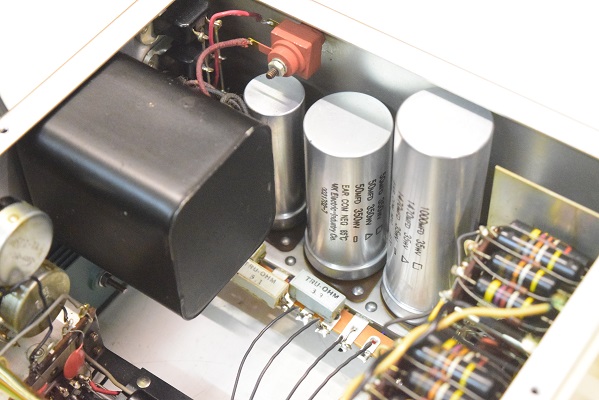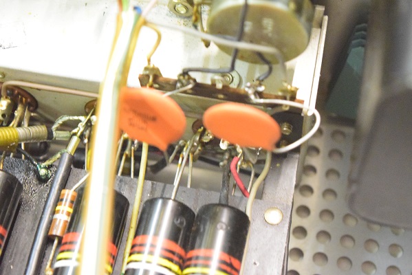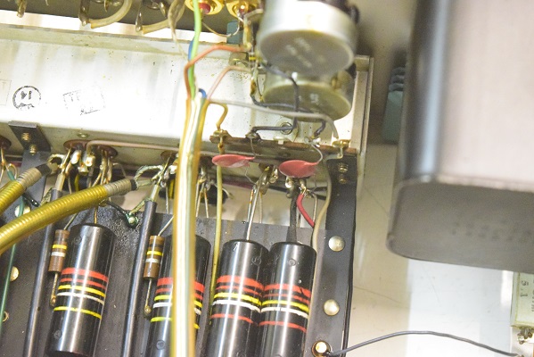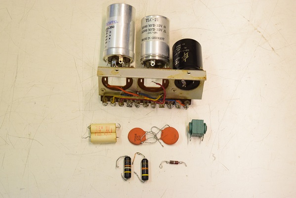 前回の他での改造で電解ブロックコンデンサーがフレームにボンドで付けられていました。この為交換する事ができないのでフレームごとアッセンブリーでの交換になりました。丸い大きなセラミックコンデンサーは良品ですが音が変りMarantz7の音では無くなってくるので交換しました。