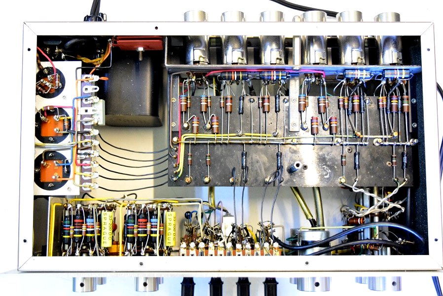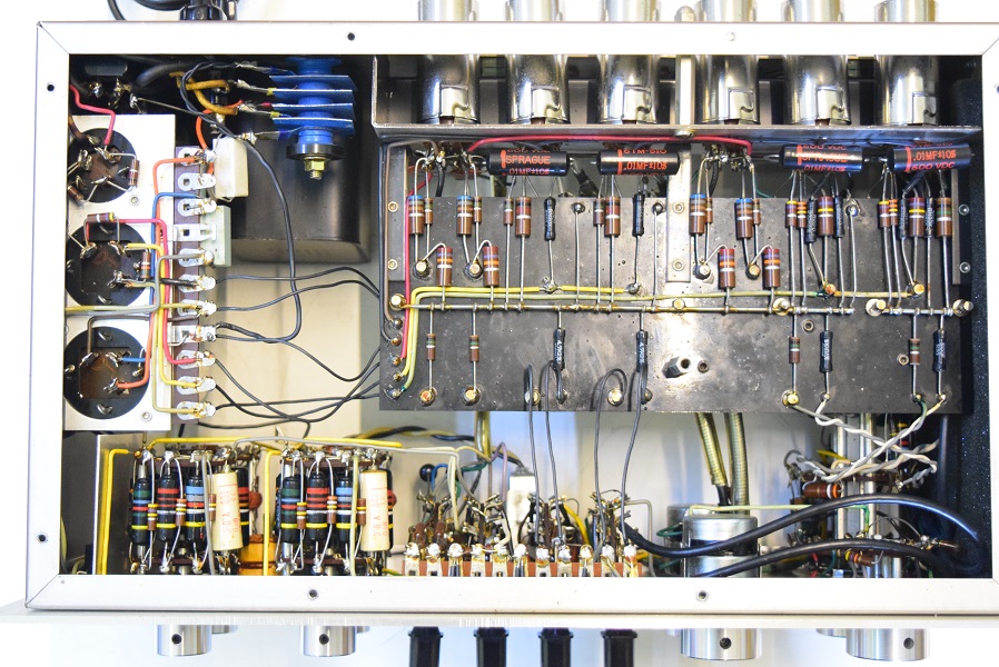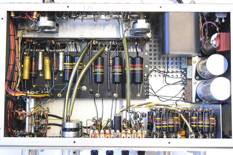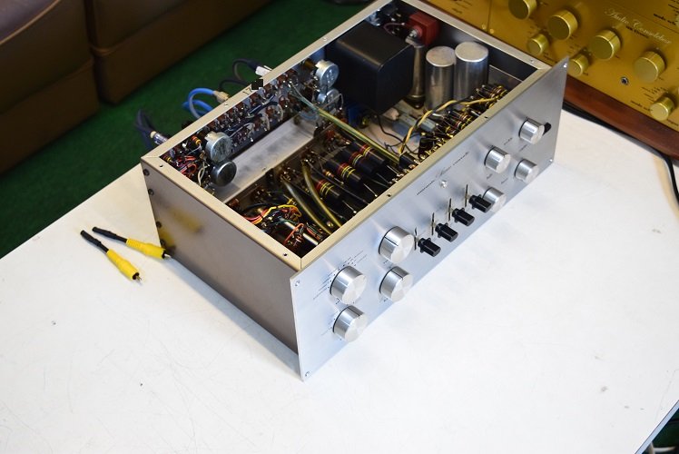 内部上面です。基板上のカップリングコンデンサーは全て良品バンブルビーです。一部まだ良品が残っていたので交換したのはフォノイコ0.1uFとラインの0.22uF/400Vです。