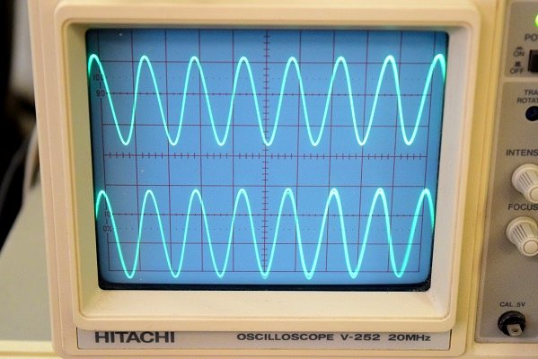 左右の出力波形の観測中です。左右とも綺麗な波形が出ています。