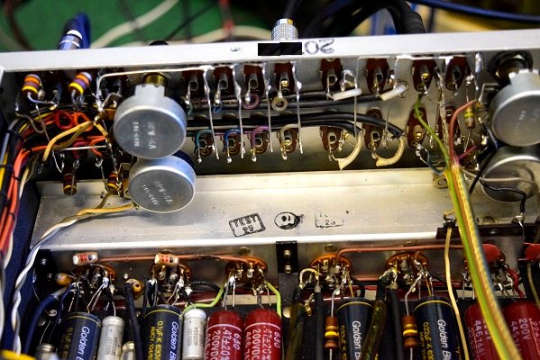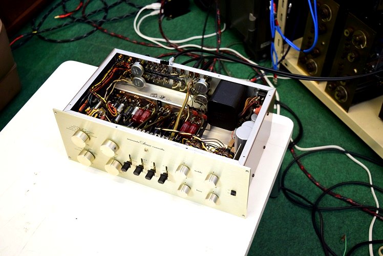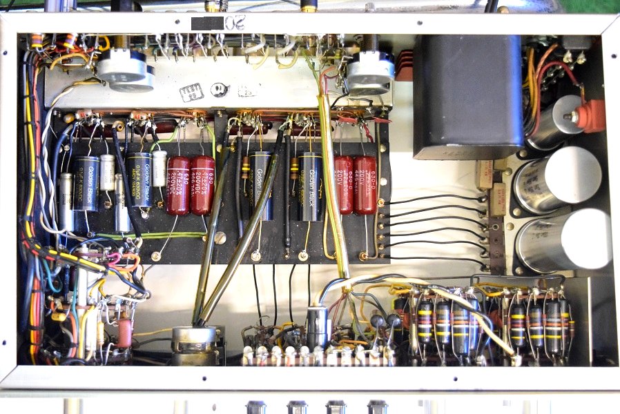 内部です。基板上のカップリングコンデンサーは全て交換しました。フォノイコのカソードバイパスコンも4本とも純正SPRAGUEの新品と交換しました。RIAA偏差のコンデンサーも交換しました。ラインのセラミックコンデンサーも純正SPRAGUEの新品に交換しました。