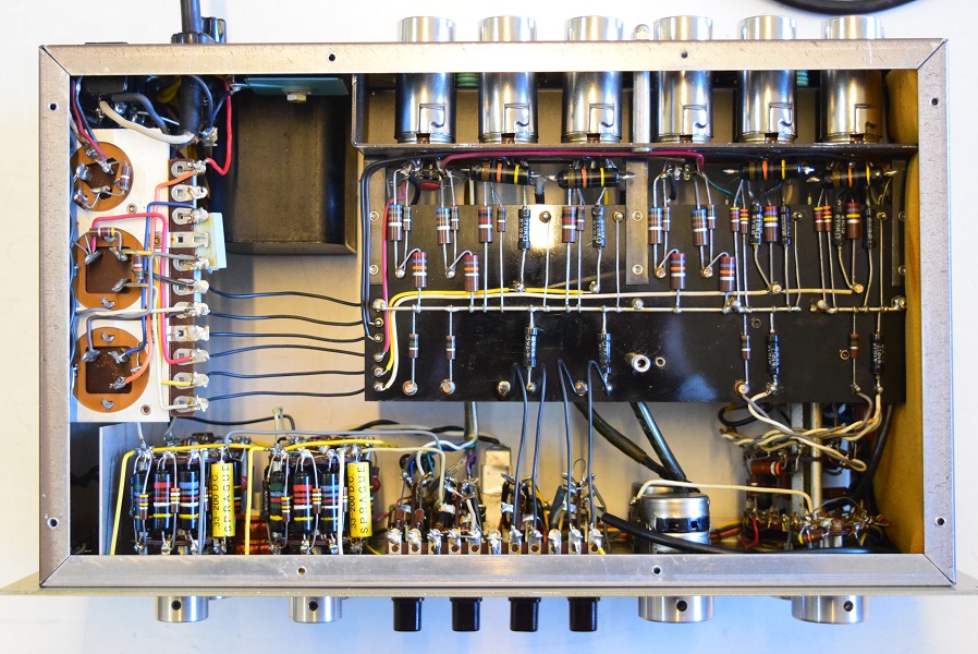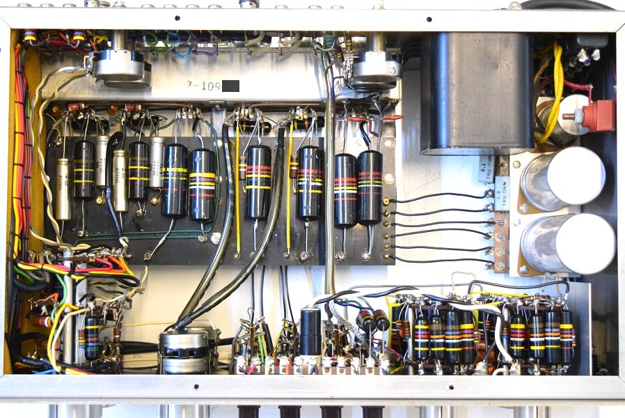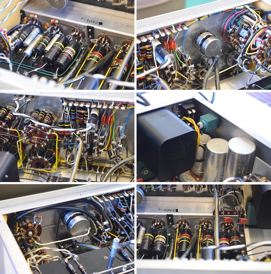 上の画像の赤茶色のセラミックコンデンサーと下の画像の左下、2個の黄色い0.33uFコンデンサーはこちらで交換した純正SPRAGUEのNOS新品です。他では絶対手に入りません。