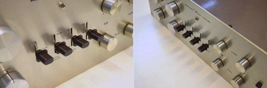 このセンターレバーのノブは代品の少し明るい茶色ではなく、根元にパテントNo.の刻印のあるMarantz純正の深いこげ茶色です。