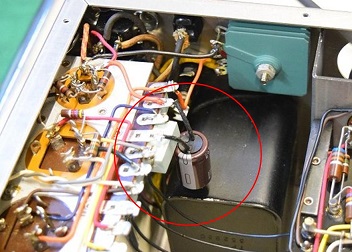 左上の画像の赤丸円の高圧セレンの真下にφ25電解ブロックコンデンサーがあります。この小さなブロックコンデンサーはこの形と大きさしかこの場所に収まりません。