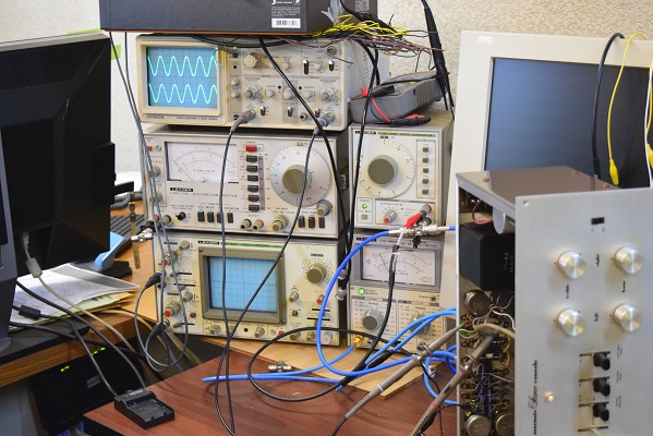 見えにくいのですが測定器右下のミリバルのメーターには左右とも同じ出力電圧が出ています。