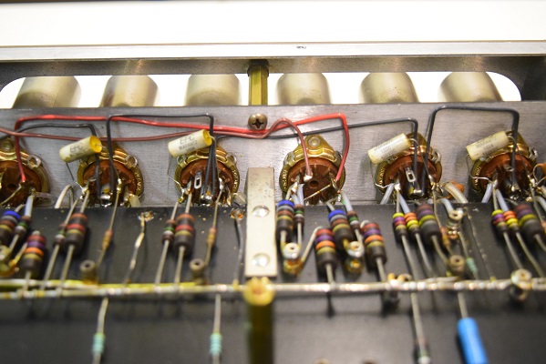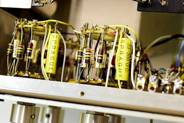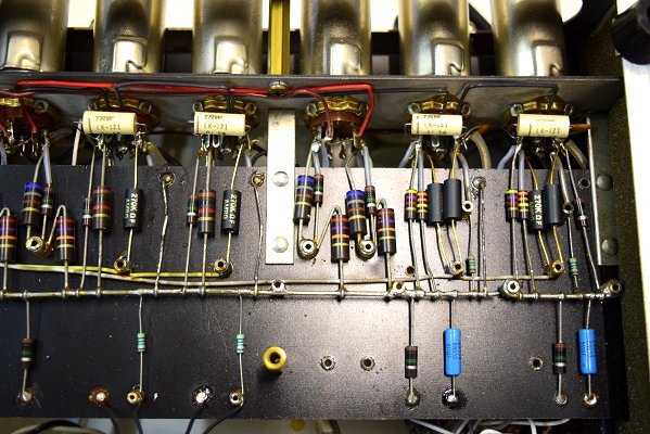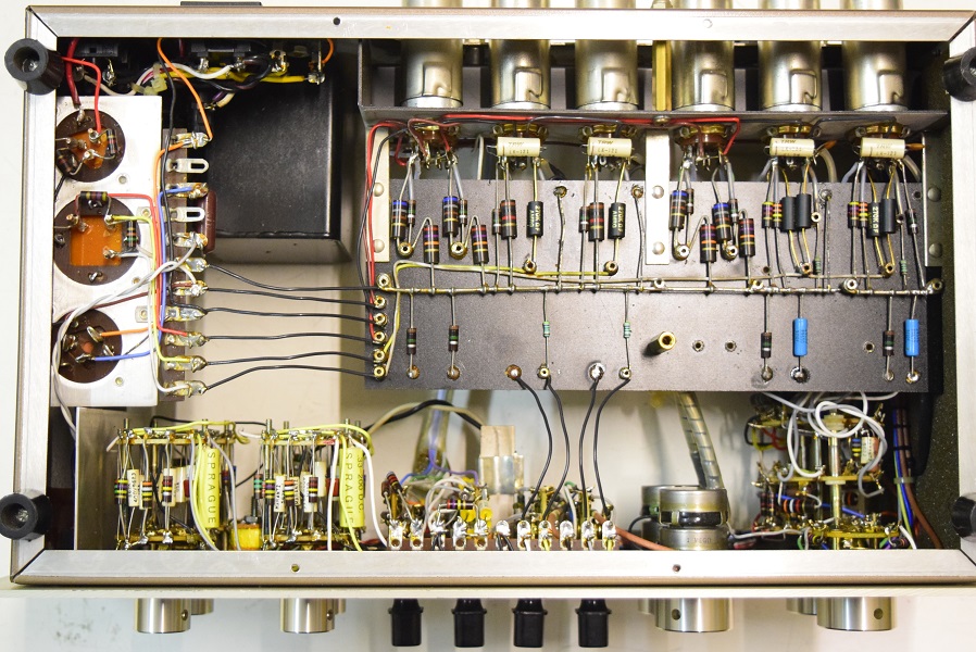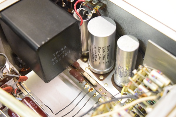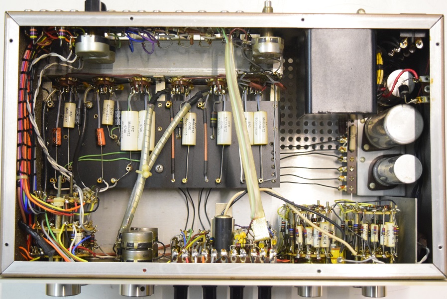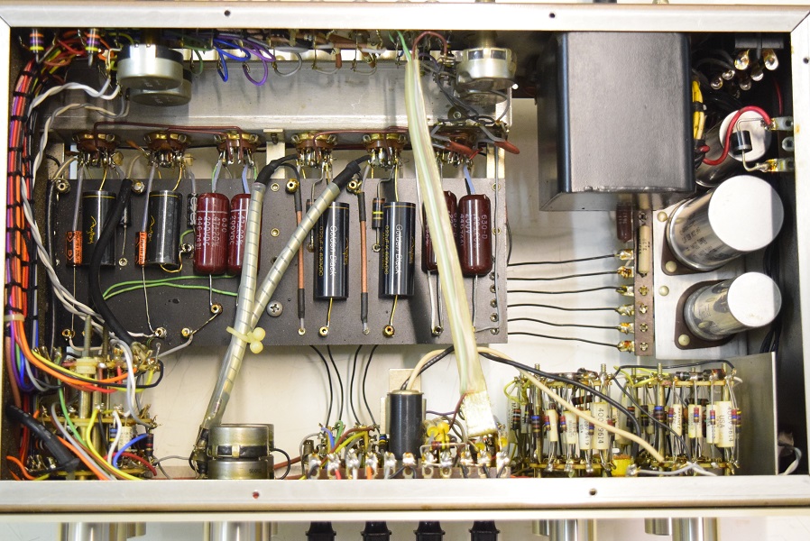内部です。殆どのカップリングコンデンサーをMarantz7オリジナルに使用する部品でレストアしました。セラミックコンデンサーも純正SPRAGUEの新品に交換しました。電源も電解ブロックコンデンサーの高圧2本をオリジナル仕様の新品に交換しました。