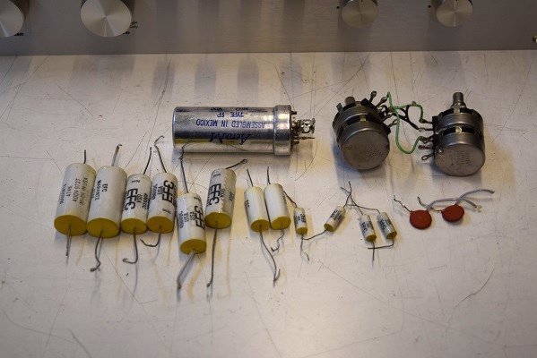 これらカップリングコンデンサーを当工房で#7オリジナルのレストアに使う組み合わせの代品に全て交換し、ボリュームもMarantz7オリジナル後期型純正の東京コスモスを当工房で少し手を加えることにより、オリジナル純正クラロスタットのように抜けの良い音に変えることができます。