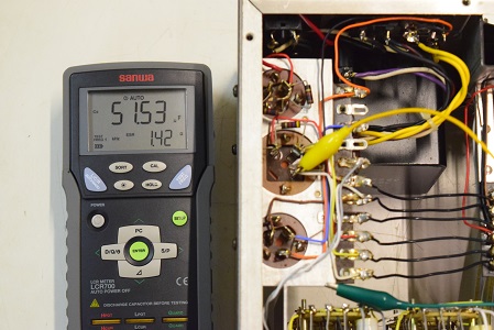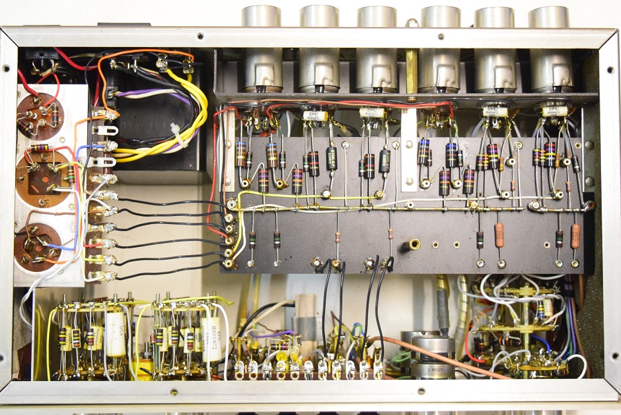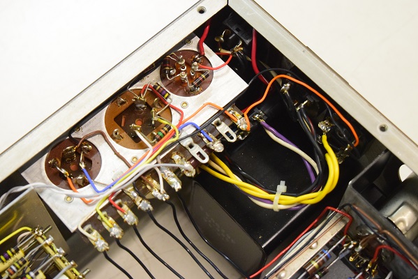 右の出力が出ていません。 ミリバルの針が振れずオシロの波形も出ません。いろいろ探るとラインアンプの初段後から無信号状態です。真空管は大丈夫なので恐らくコンデンサーや抵抗が飛んでいるのでしょう。