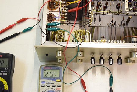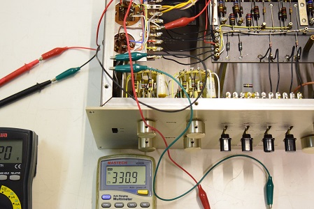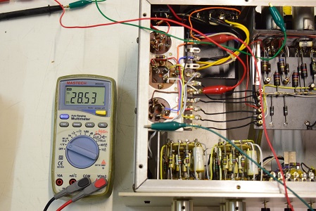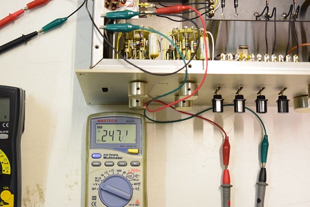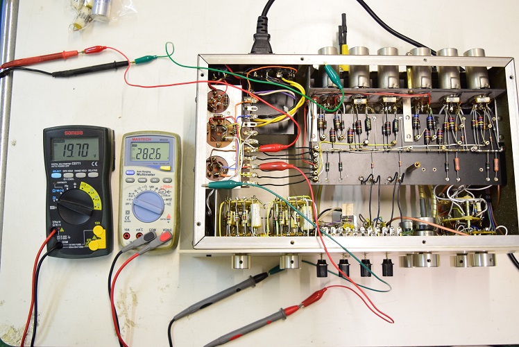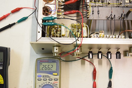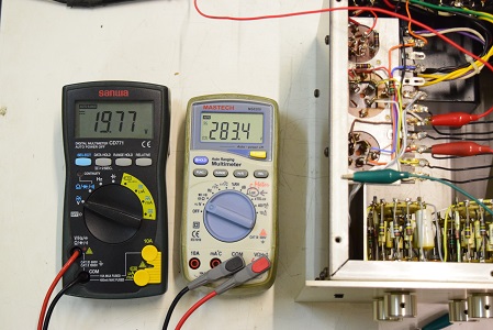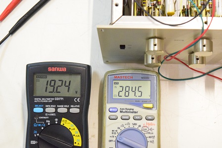 左テスターはヒーター電圧です。19.77Vと極めて良い値です。右の白いテスターは高圧B1で283.4Vとこちらも極めて良い値です。