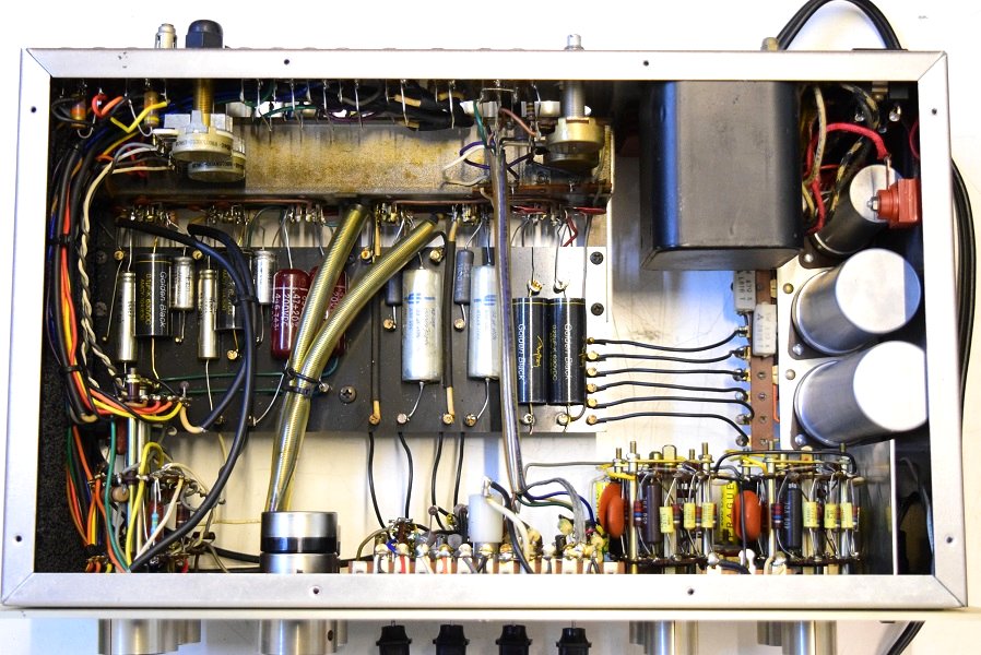 内部上面です。音質に左右するカップリングコンデンサーは当工房が厳選した極めて音の良い物の組み合わせです。