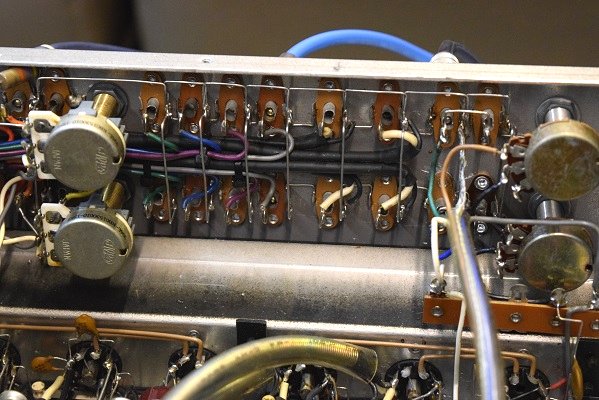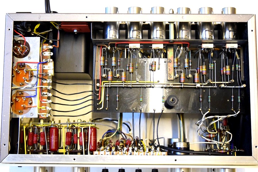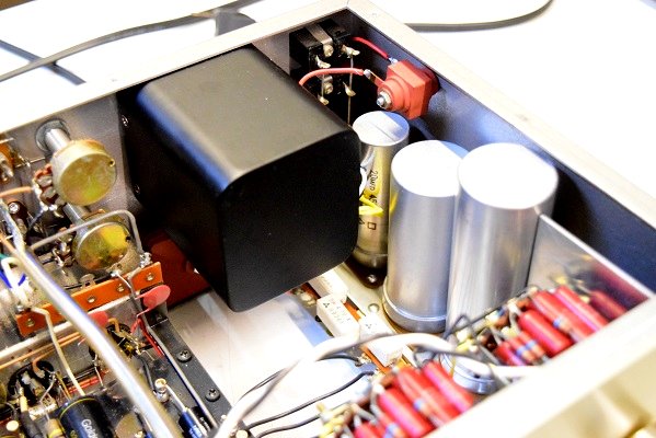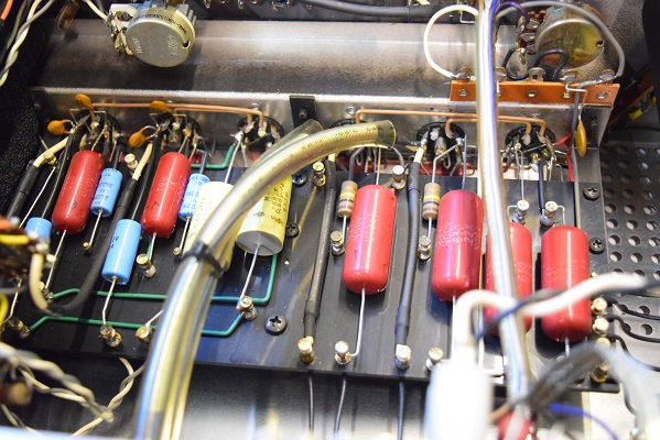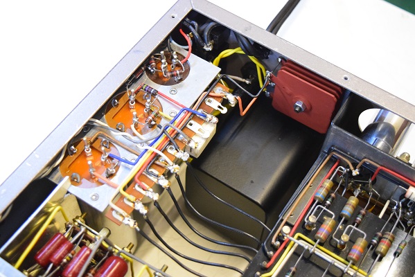 内部上面です。カップリングコンデンサー、カソードバイパスコン、メイン、バランスボリューム、電源回路の主なものは全て交換しました。