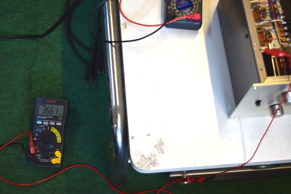 電源トランス交換後のコンセント-筐体間の漏れ電圧です。AC36.61Vで当然ながら良好です。