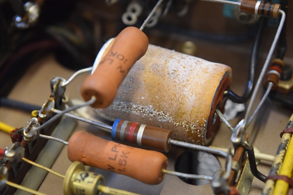 バイアスのブロックコンデンサーです。こちらも経年で被覆が塩を吹いています。