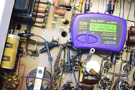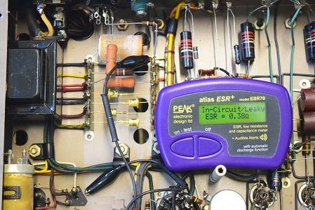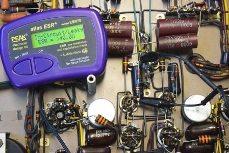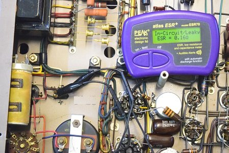 初段管カソードバイパスコン左です。リークしてESRは最大値を表示しています。不良です。