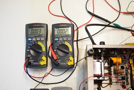 各テスターは左上2台が左右の出力の残留ノイズです。左下のアナログテスターはバイアスC電圧、白いデジタルテスターは高圧B電圧です。
