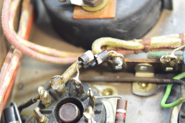 この抵抗は泡を吹いて煙がシャーシーにこびり付いています。よほどの高熱になったようです。