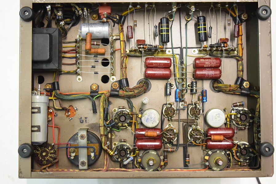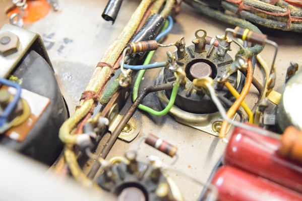 右の出力管のスクリーングリッド抵抗が燃えて破損しています。