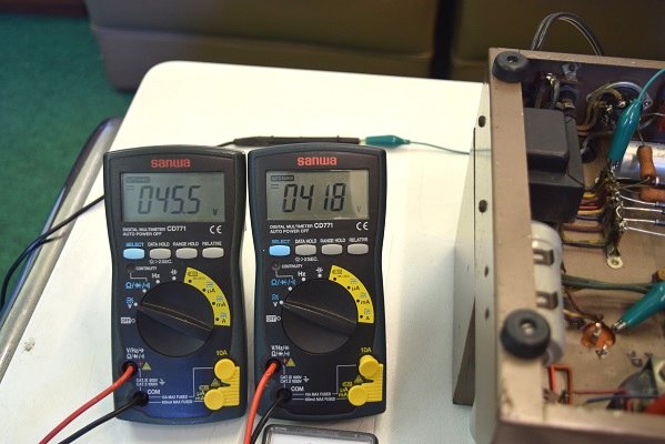 左のテスターはバイアスC電圧です。-45.5Vを示し良好です。右のテスターは高圧B1です。こちらも418Vを示し良好です。
