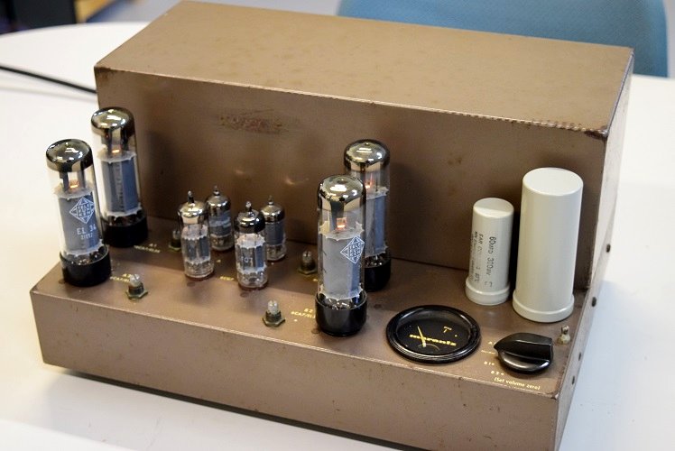 出力管はTelefunken EL34 です。 位相反転管は珍しい Mullard 6CG7 です。良い音の真空管が揃っています。