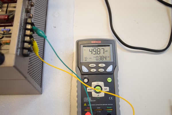 右チャンネル1次側のHOT側です。 20.77H 136.9kΩです。 これは左チャンネルの1/20のインダクタンスです。恐らく過熱で絶縁被覆がボロボロになりコイルとしては作用していない状態です。