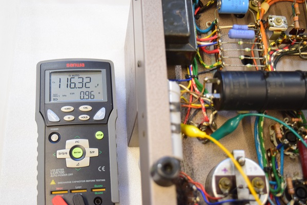 高圧のφ35です。追加の電解コンデンサーの値を含めて116.32uFです。これが2ブロックあります。