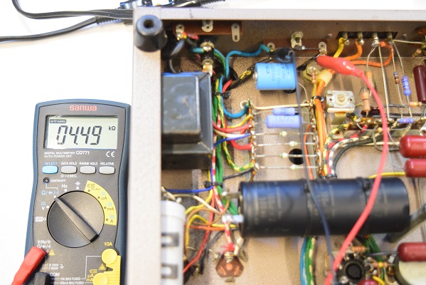 バイアスメーターに直接高電流が流れていることから、出力管の電流値も異常に高くなったと推測されます。この為、電源トランスもチェックすると、上記のように1次巻線がショートし、2次側の高圧B電源とバイアスC電源の巻線もショートしています。