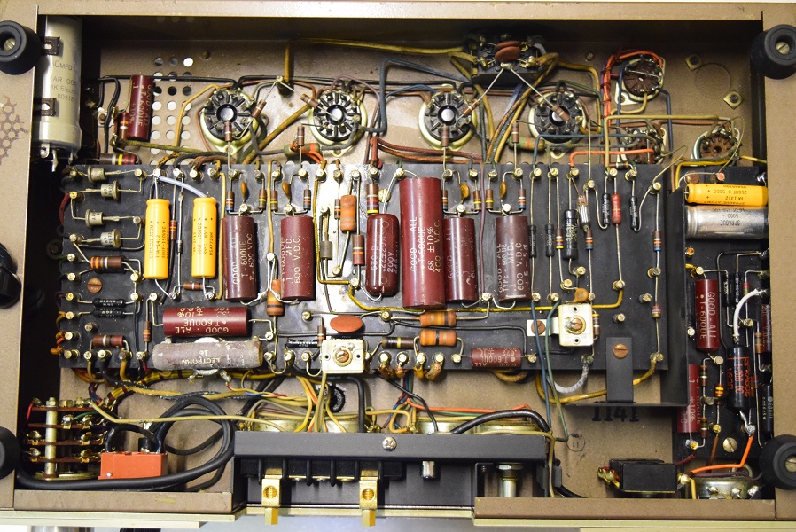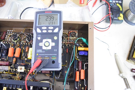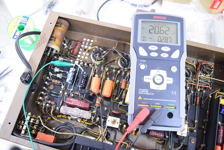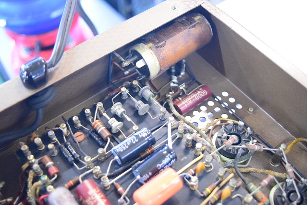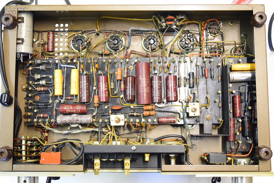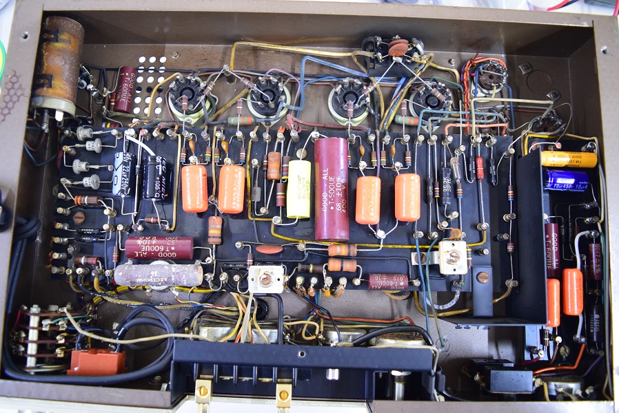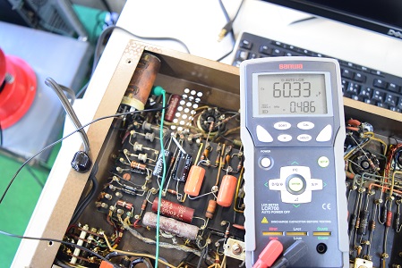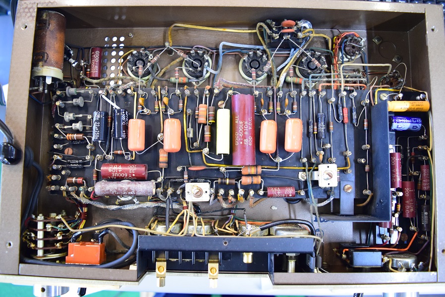 以前のレストアでカップリングコンデンサーをオレンジドロップに換えてあったところを全てMarntz9オリジナル純正のヴィンテージコンデンサー Good-Allの最初期赤茶色筒型良品に交換しました。各電解コンデンサーも国産品に換えてあったものを#9オリジナル純正SPRAGUEの新品に交換しました。電源回路もオリジナル仕様の電解ブロックコンデンサーに2本交換しました。