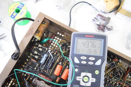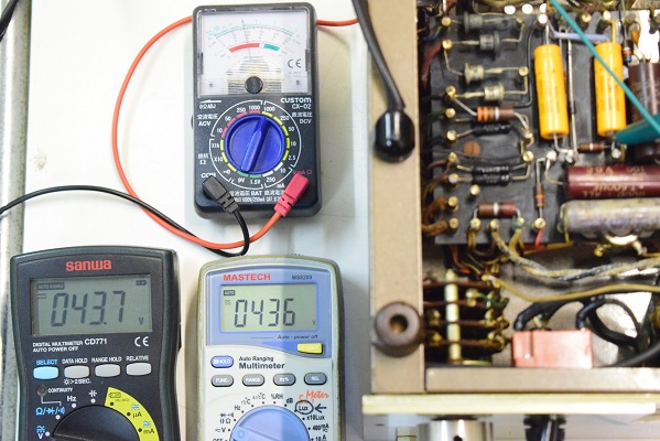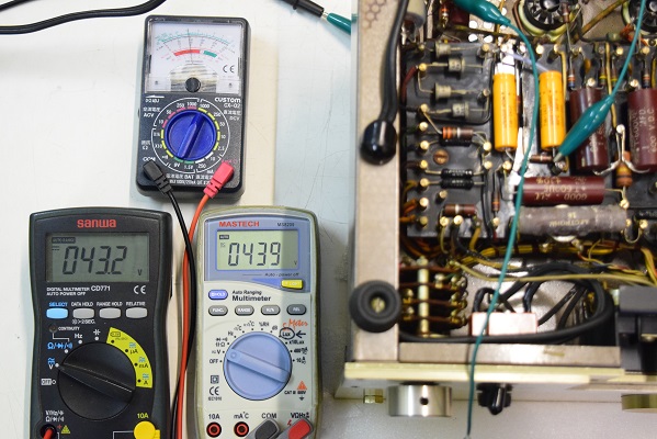 下左の黒いデジタルテスターはバイアスC電圧です。-43.7Vを示し良好です。