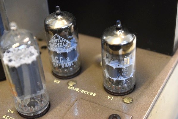 電圧増幅管はTelefunken CCa <>有 金ピン 左右で4本です。これはECC88互換の中でも極めて良い音で入手困難です。ECC83に対するECC803sに相当します。