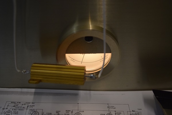 1時間以上鳴らした後で最後の調整として全てのバイアスを既定の印の位置まで上げると、今度は今回ヒーズが切れていない正常なアンプのV7が左のメーター様にこれ以上調整ボリュームを上げても針が上がりません。他にもV5は調整ボリュームがいっぱいの位置で漸く正規の位置です。