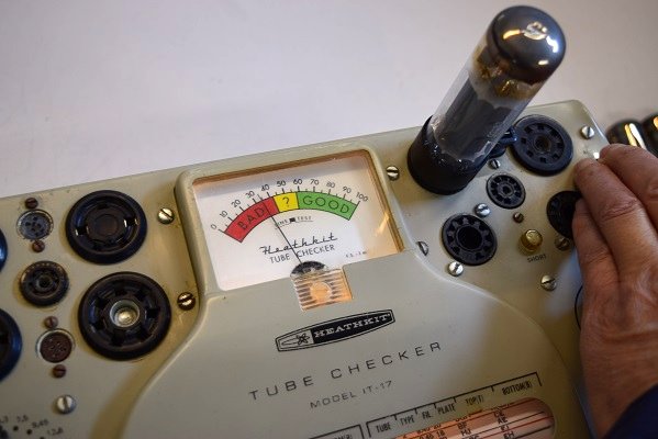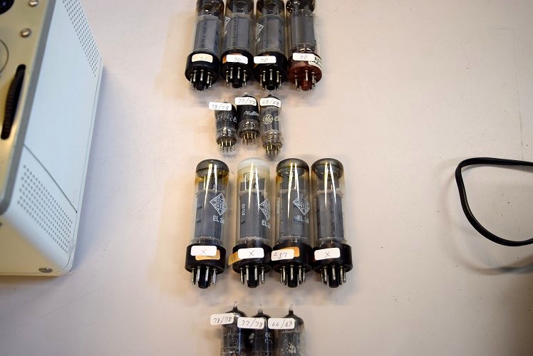 全ての真空管をチェックし、それぞれの値をラベルに記載しています。手前の列の出力管は4本とも廃棄値もしくは白化した破損品です。小さなドライブ管は一般に寿命が長いので3本とも良い値です。