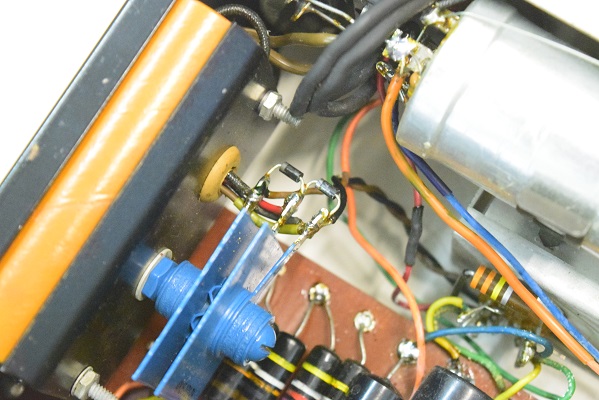 ウエスタンのコンデンサーの配線です。結構こういうところに拘るマニアの方がいますが、普通の10uF/25V程度の安い電解コンデンサーで充分です。この程度で音は変りません。