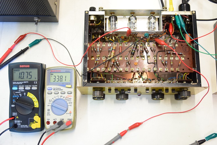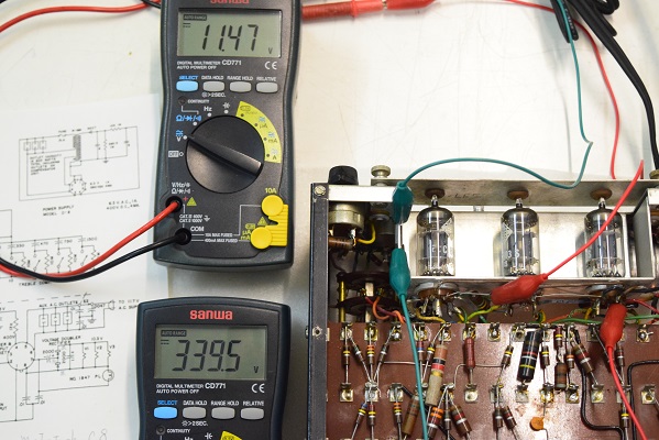 上のテスターはヒーター電圧です。少し高いですが良好です。下のテスターは高圧B1です。こちらも339.5Vを示し良好です。