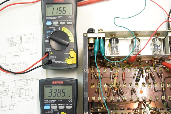 上のテスターはヒーター電圧です。11.56Vで良好です。下のテスターは高圧B1で338.5Vを示しこちらも良好です。