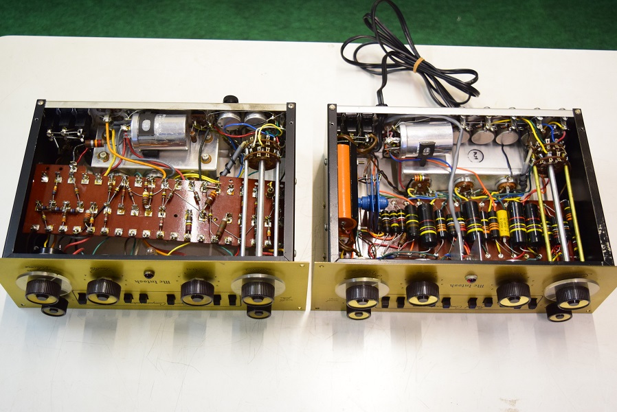 左は初期型のC-8で、ヒーターは交流点火です。右は当工房所有のものと同じ直流点火の後期型です。初期型の基板はC-4と同じくバンブルビーなど主なカップリングコンデンサーは上に配置してあります。後期型は基板の裏に配置しています。