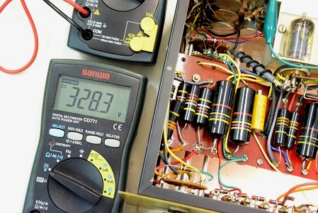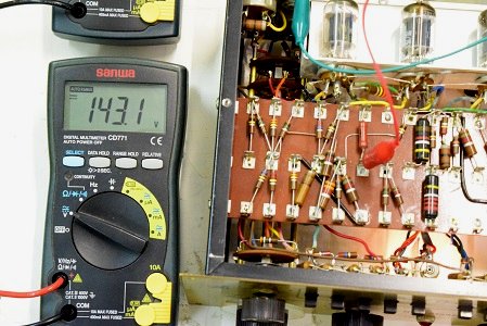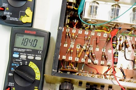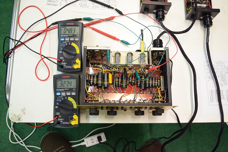 交流のヒーター電圧です。4.83Vで低い値です。本来電源トランスから出ているヒーター電圧はAC6.3Vですが、アンプ本体のヒーター回路に3オームの抵抗が入っているのでこれで電圧を落としています。