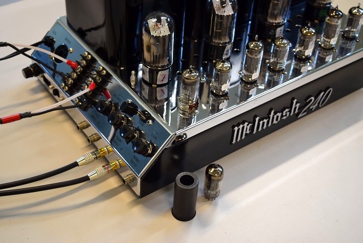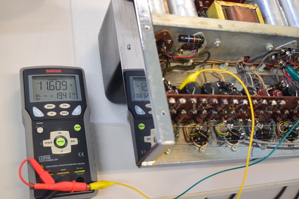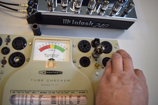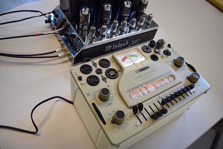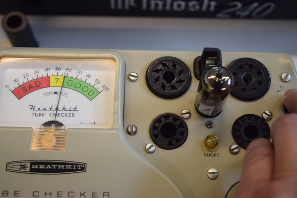 1ヶ月前のこちらでのレストアでは最後に音質面から真空管の特性も測りました。特にドライブ管の消耗が進んでいましたが、全てのドライブ管のピンを磨いて検査をしています。今回お送り頂いた真空管で先頭のシールドケースに入ったTelefunken