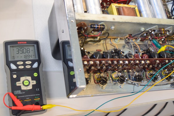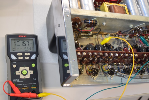こちらで音出しの確認するとやはり右側からパツパツとノイズが出ます。今回のレストアでは電源の電解ブロックコンデンサーが検査で良品の為交換していません。時折他のレストアで電解ブロックコンデンサーを良品判定で交換せずにお返しすると暫くしてノイズが出始めることがあります。検査で良品でもレストアで他の所が良くなると電源のノイズ等が目立って来る場合もあります。