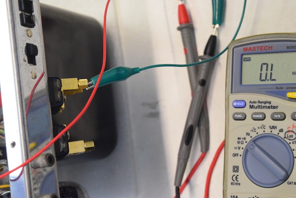 左スピーカーの内側のマイナス端子(赤)と外側のバナナプラグアダプター(緑)の導通チェックです。OL表示は導通していない事を表しています。