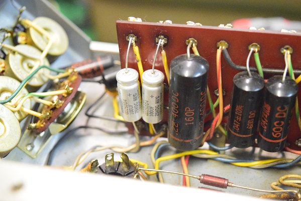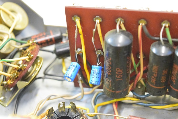 初段管カソードバイパスコンです。違うタイプのものに交換されています。手抜きなのか配線を外さないで途中で繋いであります。