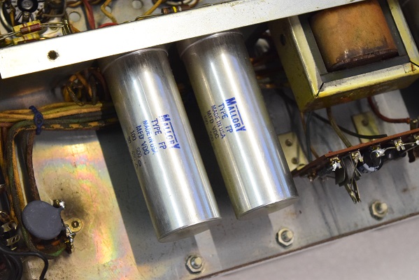 高圧の倍電圧電解コンデンサーはオリジナルが付いています。前回のレストアでは代品が無かったのか電解コンデンサーをパラに繋いであります。